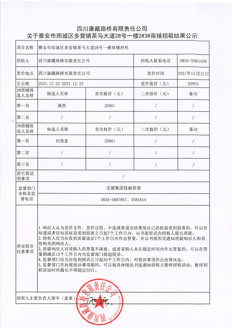 四川康藏路橋有限責任公司關(guān)于雅安市雨城區(qū)多營鎮(zhèn)茶馬大道28號一樓2#3#商鋪招租結(jié)果公示