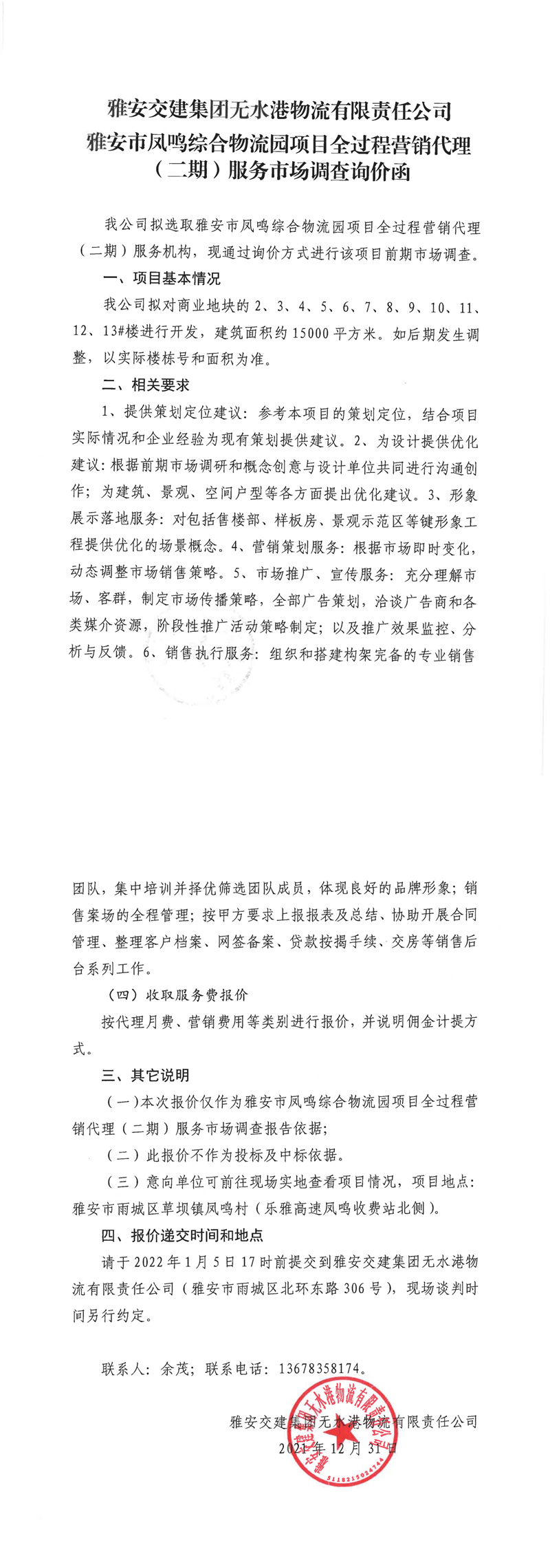 雅安交建集團無水港物流有限責(zé)任公司雅安市鳳鳴綜合物流園項目全過程營銷代理(二期)服務(wù)市場調(diào)查詢價函