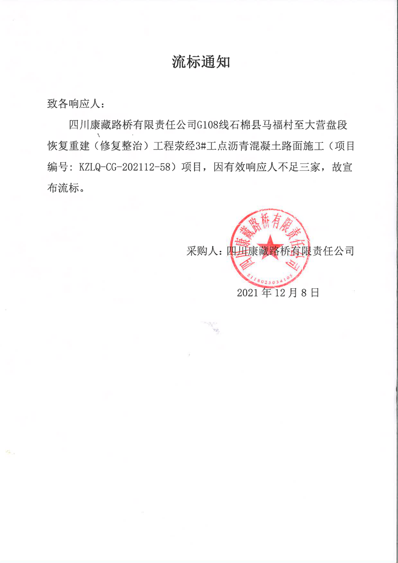 四川康藏路橋有限責(zé)任公司G108線石棉縣馬福村至大營(yíng)盤段恢復(fù)重建(修復(fù)整治)工程滎經(jīng)3#工點(diǎn)瀝青混凝土路面施工流標(biāo)通知