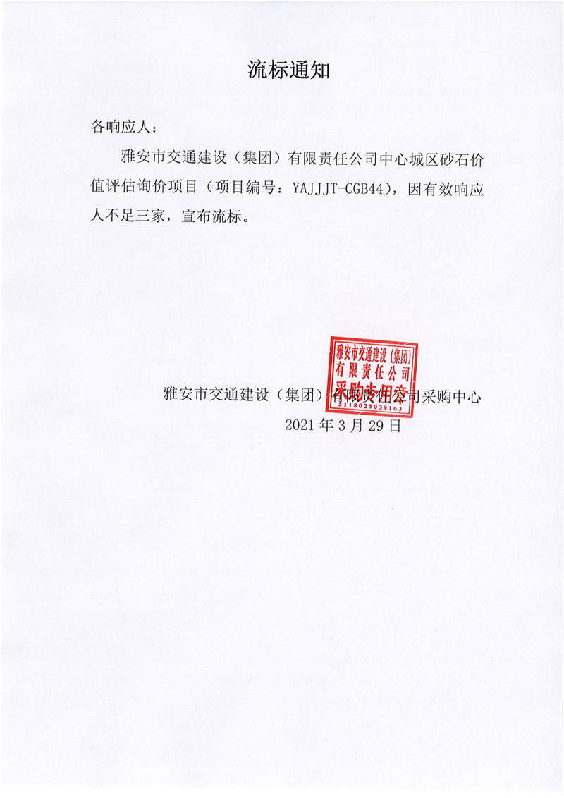 雅安市交通建設(shè)(集團)有限責(zé)任公司中心城區(qū)砂石價值評估項目流標(biāo)通知