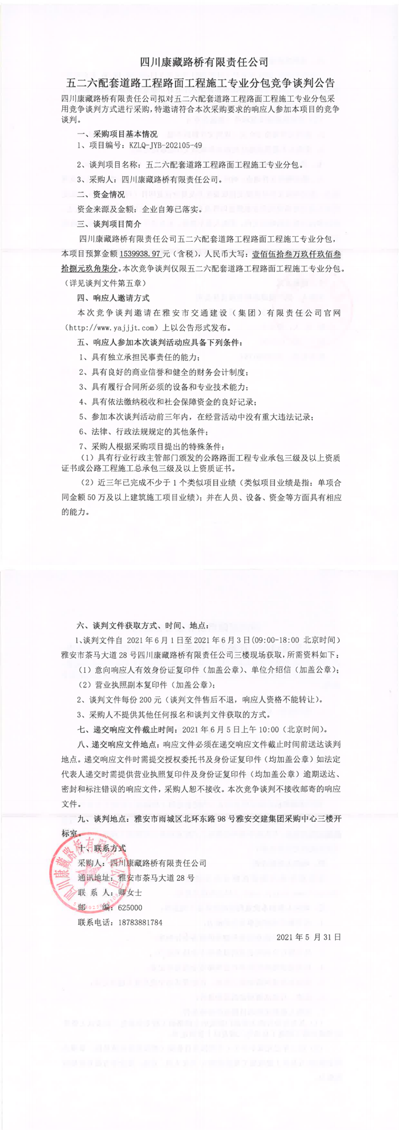 四川康藏路橋有限責任公司五二六配套道路工程路面工程施工專業(yè)分包競爭談判公告