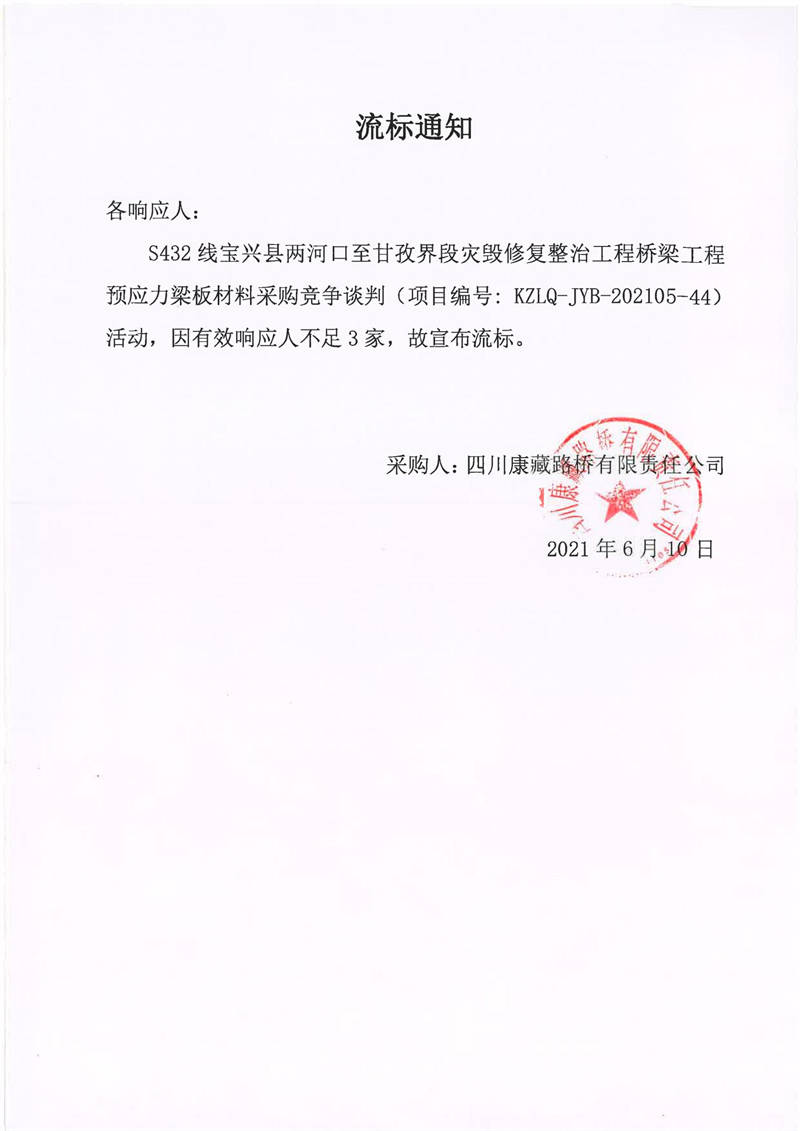四川康藏路橋有限責(zé)任公司S432線寶興縣兩河口至甘孜界段災(zāi)毀修復(fù)整治工程橋梁工程預(yù)應(yīng)力梁板材料采購競爭談判流標通知