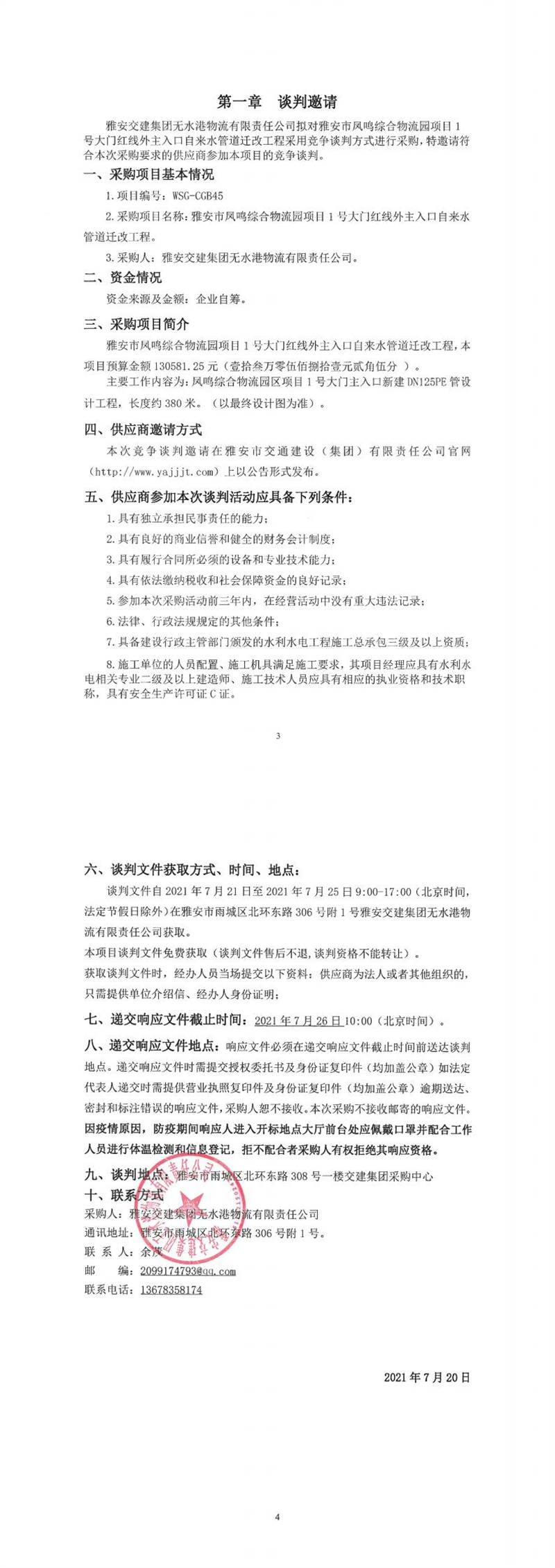 雅安交建集團(tuán)無(wú)水港物流有限責(zé)任公司雅安市鳳鳴綜合物流園項(xiàng)目1號(hào)大門紅線外主入口自來(lái)水管道遷改工程競(jìng)爭(zhēng)談判公告