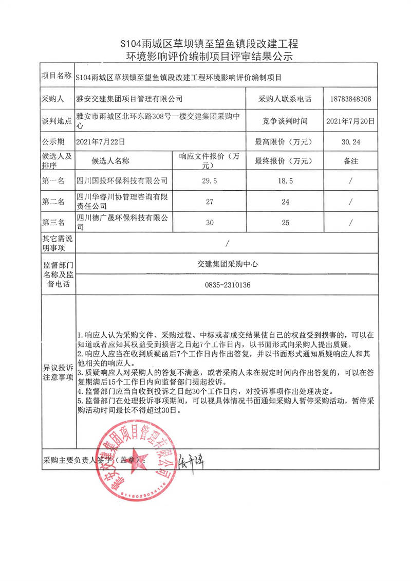 雅安交建集團(tuán)項(xiàng)目管理有限公司S104雨城區(qū)草壩鎮(zhèn)至望魚(yú)鎮(zhèn)段改建工程水土保持方案編制服務(wù)項(xiàng)目評(píng)審結(jié)果公示
