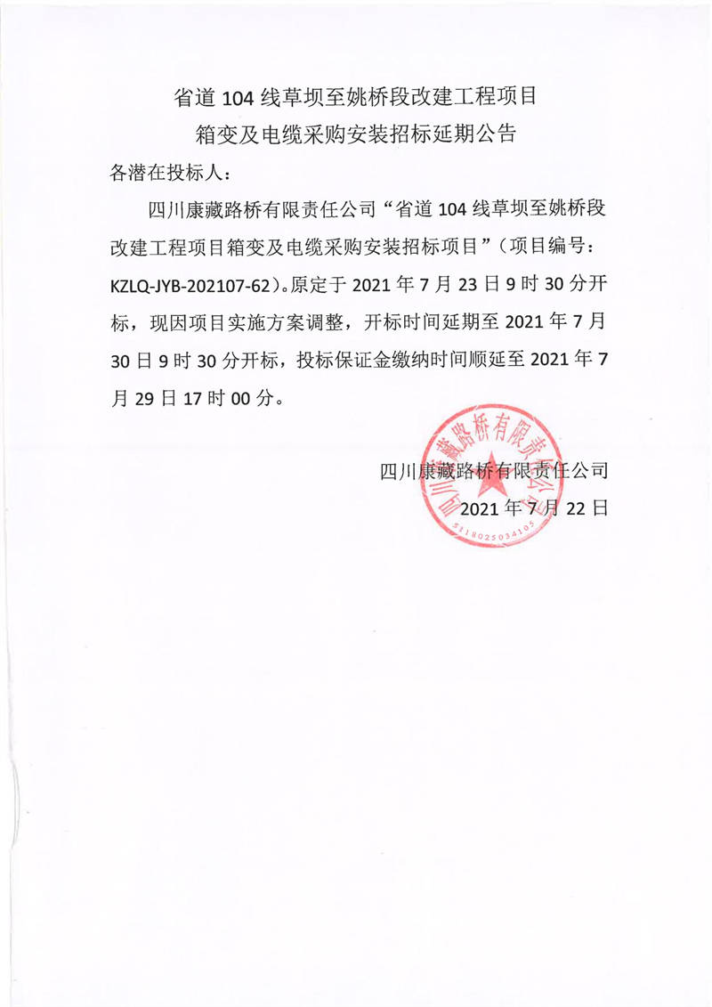四川康藏路橋有限責(zé)任公司省道104線草壩至姚橋段改建項目箱變及電纜采購安裝招標(biāo)延期公告