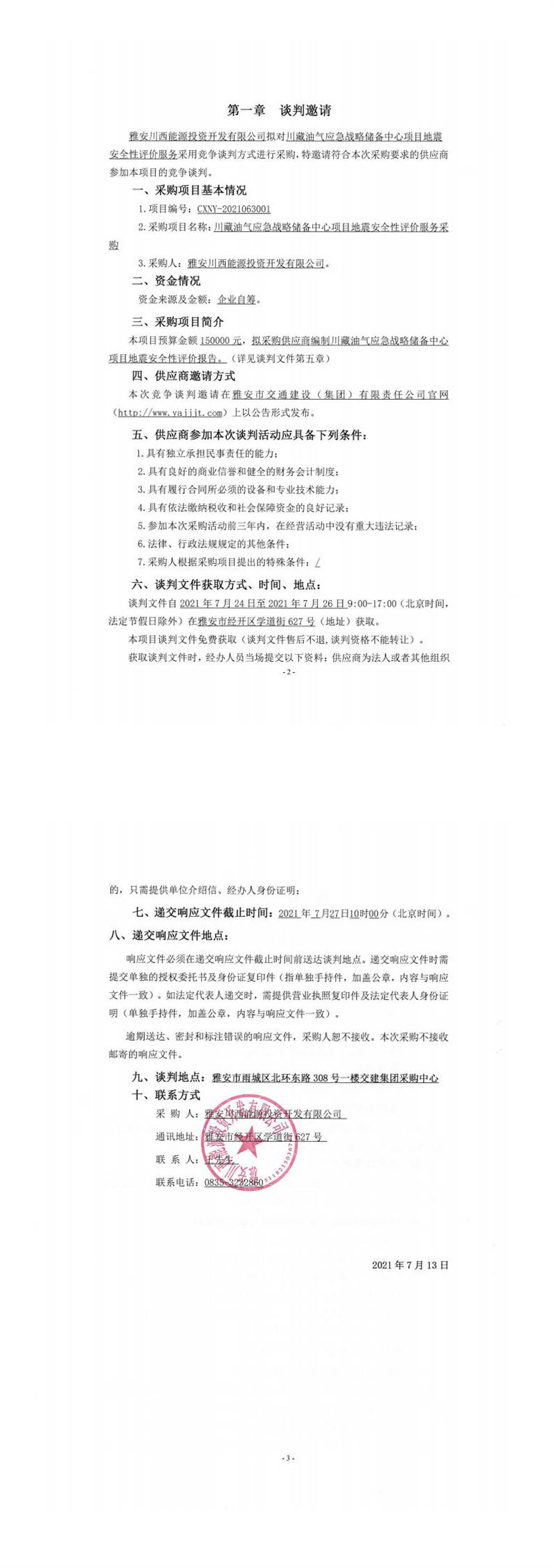 雅安川西能源投資開(kāi)發(fā)有限公司川藏油氣應(yīng)急戰(zhàn)略?xún)?chǔ)備中心項(xiàng)目地震安全性評(píng)價(jià)服務(wù)采購(gòu)競(jìng)爭(zhēng)談判公告