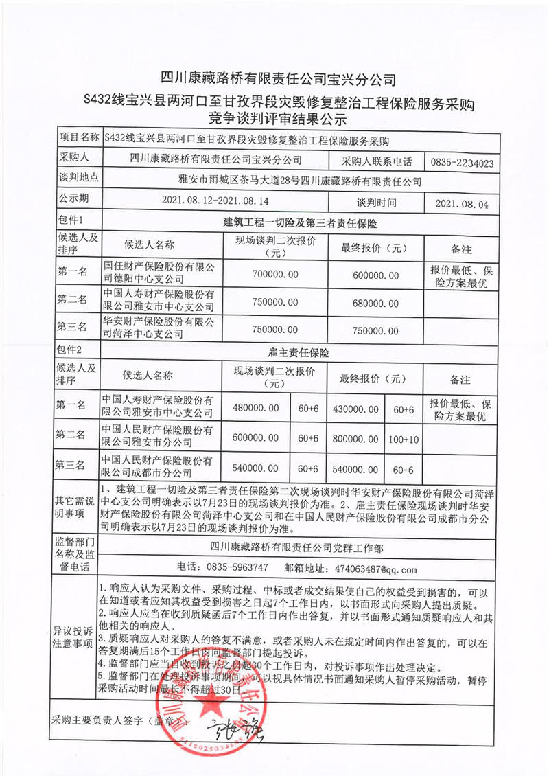 四川康藏路橋有限責(zé)任公司寶興分公司S432線寶興縣兩河口至甘孜界段災(zāi)毀修復(fù)整治工程保險(xiǎn)服務(wù)采購競爭談判評(píng)審結(jié)果公示
