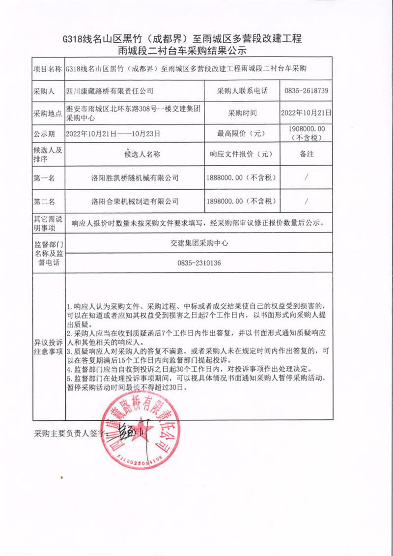 四川康藏路橋有限責(zé)任公司G318線名山區(qū)黑竹(成都界)至雨城區(qū)多營段改建工程雨城段二襯臺(tái)車采購結(jié)果公示
