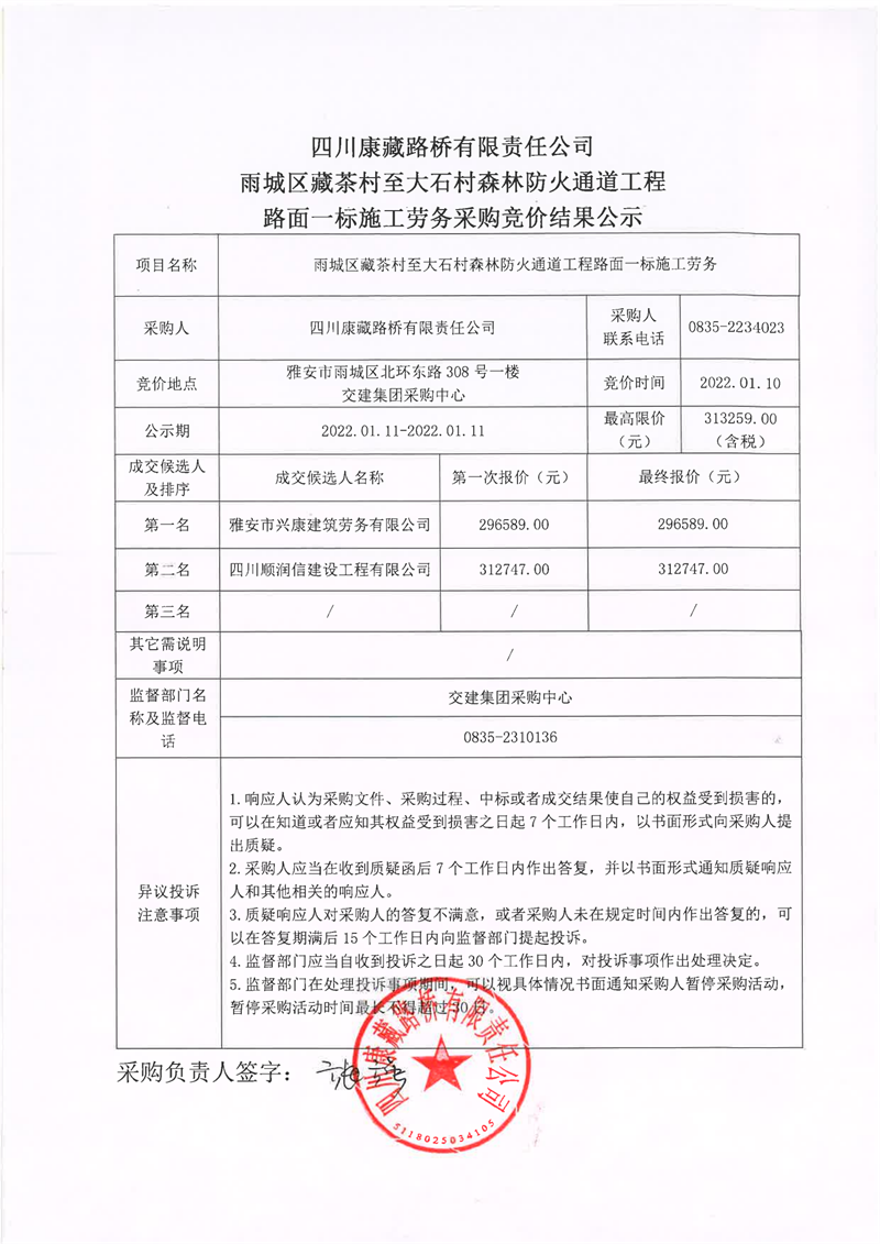 四川康藏路橋有限責(zé)任公司雨城區(qū)藏茶村至大石村森林防火通道工程路面一標(biāo)施工勞務(wù)采購競價結(jié)果公示