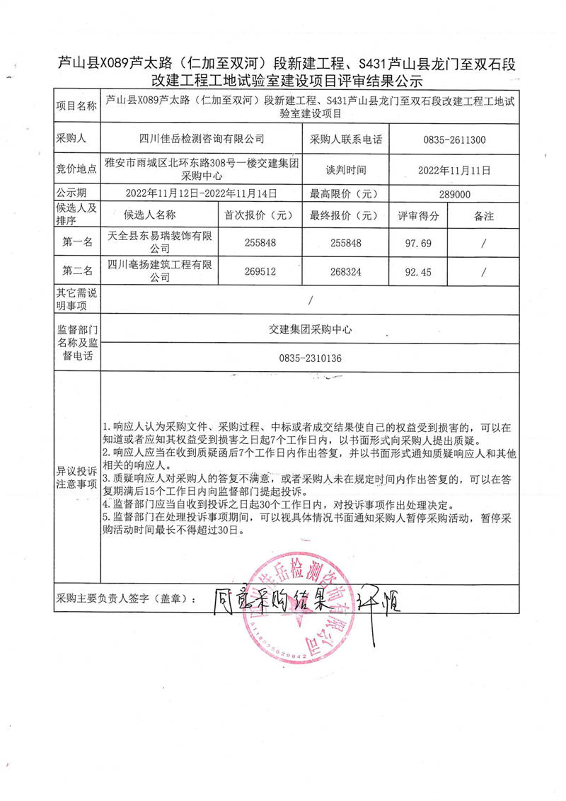 四川佳岳檢測咨詢有限公司蘆山縣X089蘆太路(仁加至雙河)段新建工程、S431蘆山縣龍門至雙石段改建工程工地試驗(yàn)室建設(shè)項(xiàng)目評(píng)審結(jié)果公示