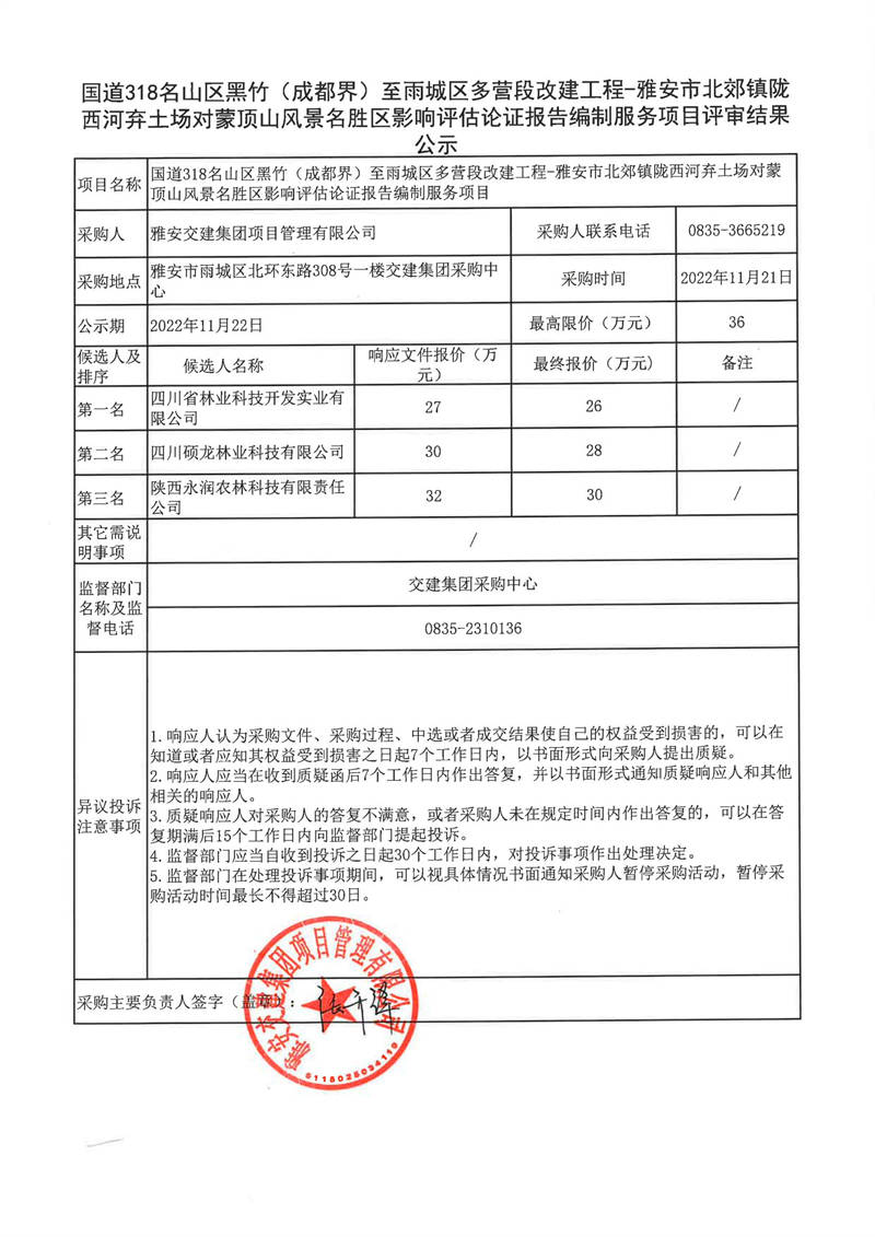 雅安交建集團(tuán)項(xiàng)目管理有限公司國道318名山區(qū)黑竹(成都界)至雨城區(qū)多營段改建工程-雅安市北郊鎮(zhèn)隴西河棄土場對蒙頂山風(fēng)景名勝區(qū)影響評估論證報告編制服務(wù)評審結(jié)果公示