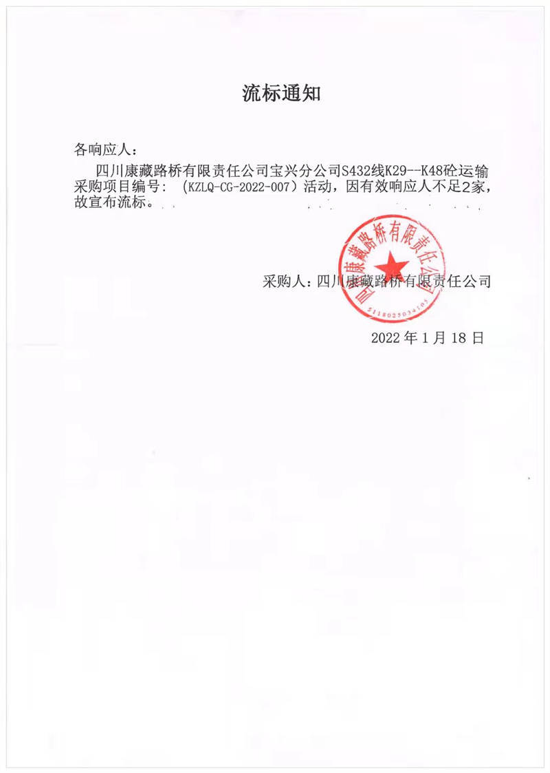 四川康藏路橋有限責(zé)任公司寶興分公司S432線K29-K48砼運(yùn)輸采購(gòu)項(xiàng)目流標(biāo)通知