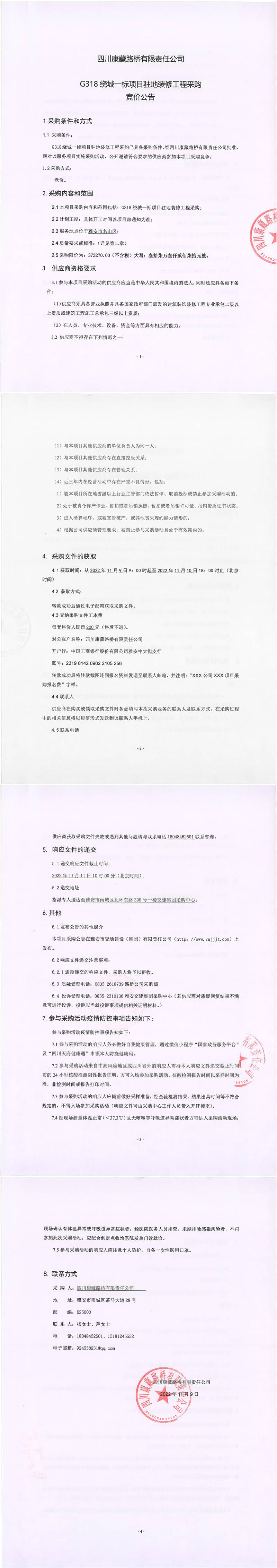 四川康藏路橋有限責(zé)任公司G318繞城一標(biāo)項(xiàng)目駐地裝修工程采購(gòu)競(jìng)價(jià)公告