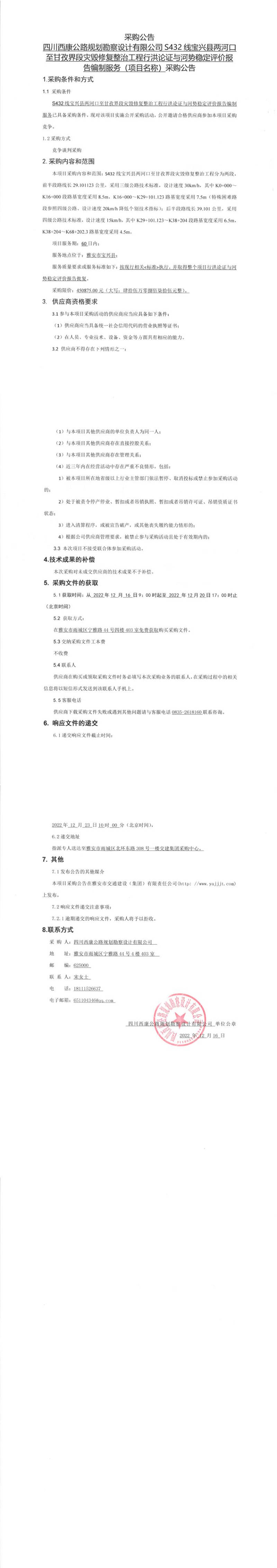 四川西康公路規(guī)劃勘察設(shè)計有限公司S432線寶興縣兩河口至甘孜界段災(zāi)毀修復(fù)整治工程行洪論證與河勢穩(wěn)定評價報告編制服務(wù)(項目名稱)采購公告