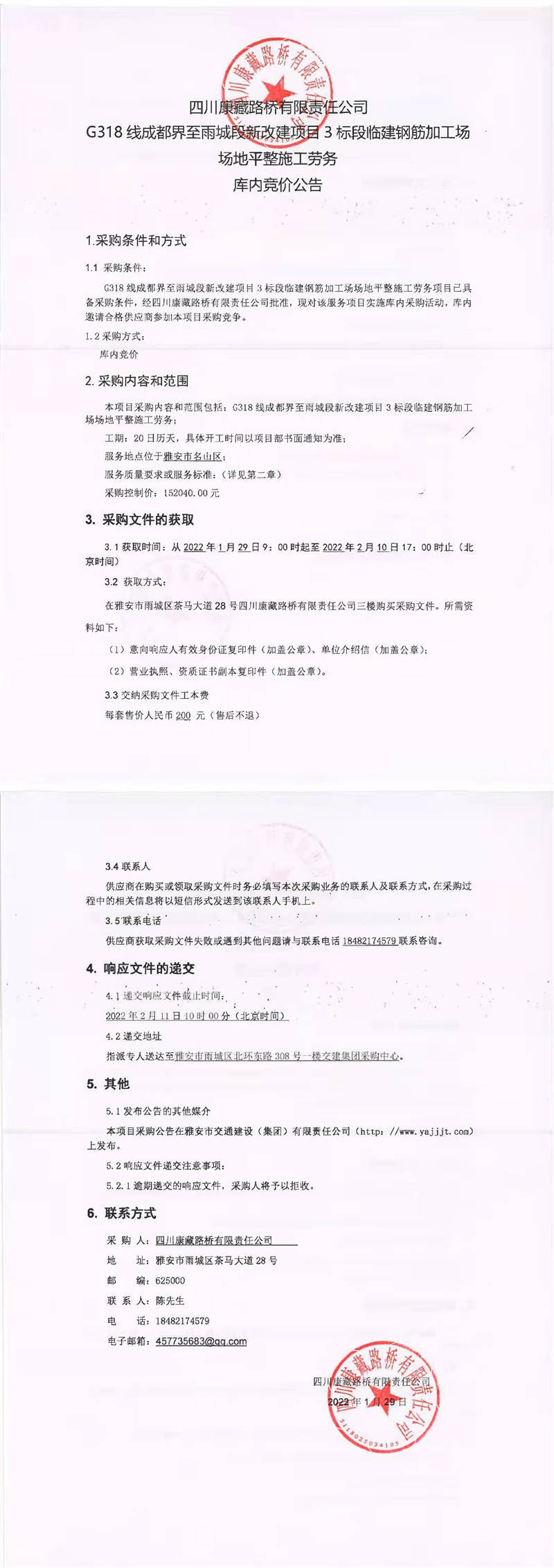 四川康藏路橋有限責任公司G318線成都界至雨城段新改建項目3標段臨建鋼筋加工場場地平整施工勞務庫內競價公告