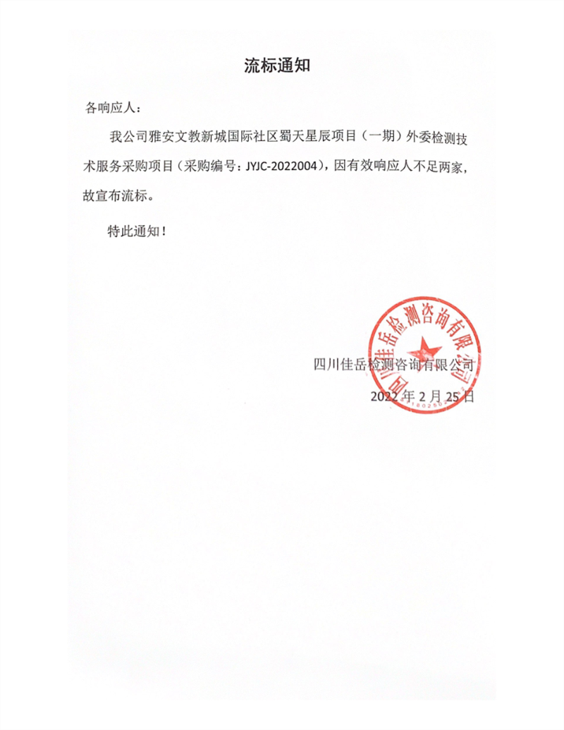 四川佳岳檢測(cè)咨詢有限公司雅安文教新城國(guó)際社區(qū)蜀天星辰項(xiàng)目(一期)外委檢測(cè)服務(wù)采購(gòu)項(xiàng)目流標(biāo)通知