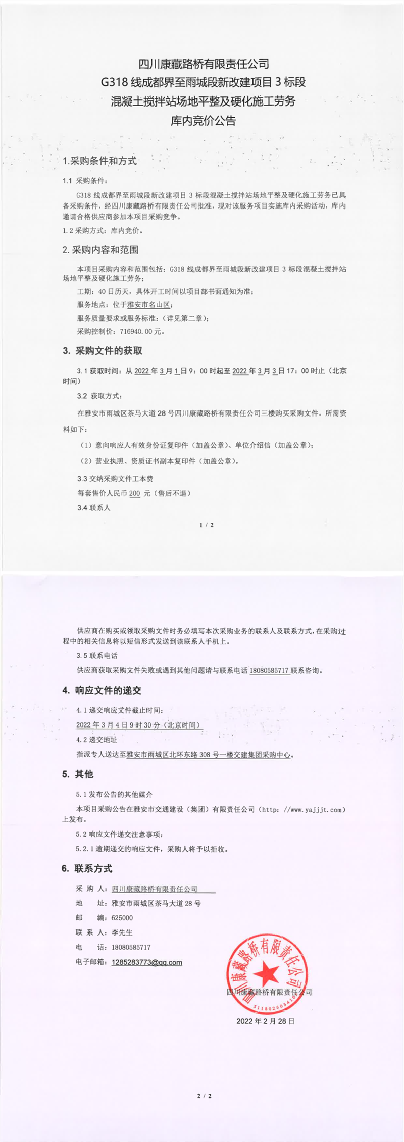 四川康藏路橋有限責任公司G318線成都界至雨城段新改建項目3標段混凝土攪拌站場地平整及硬化施工勞務庫內競價公告