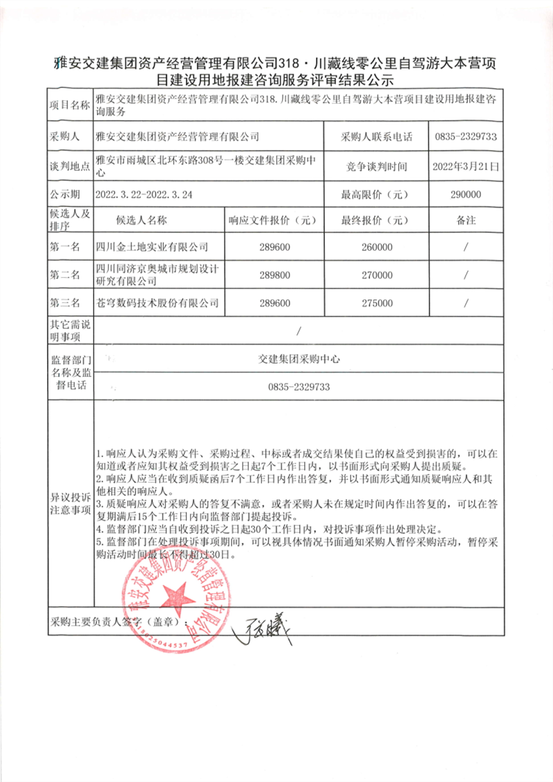 雅安交建集團(tuán)資產(chǎn)經(jīng)營管理有限公司318川藏線零公里自駕游大本營項(xiàng)目建設(shè)用地報建咨詢服務(wù)評審結(jié)果公示