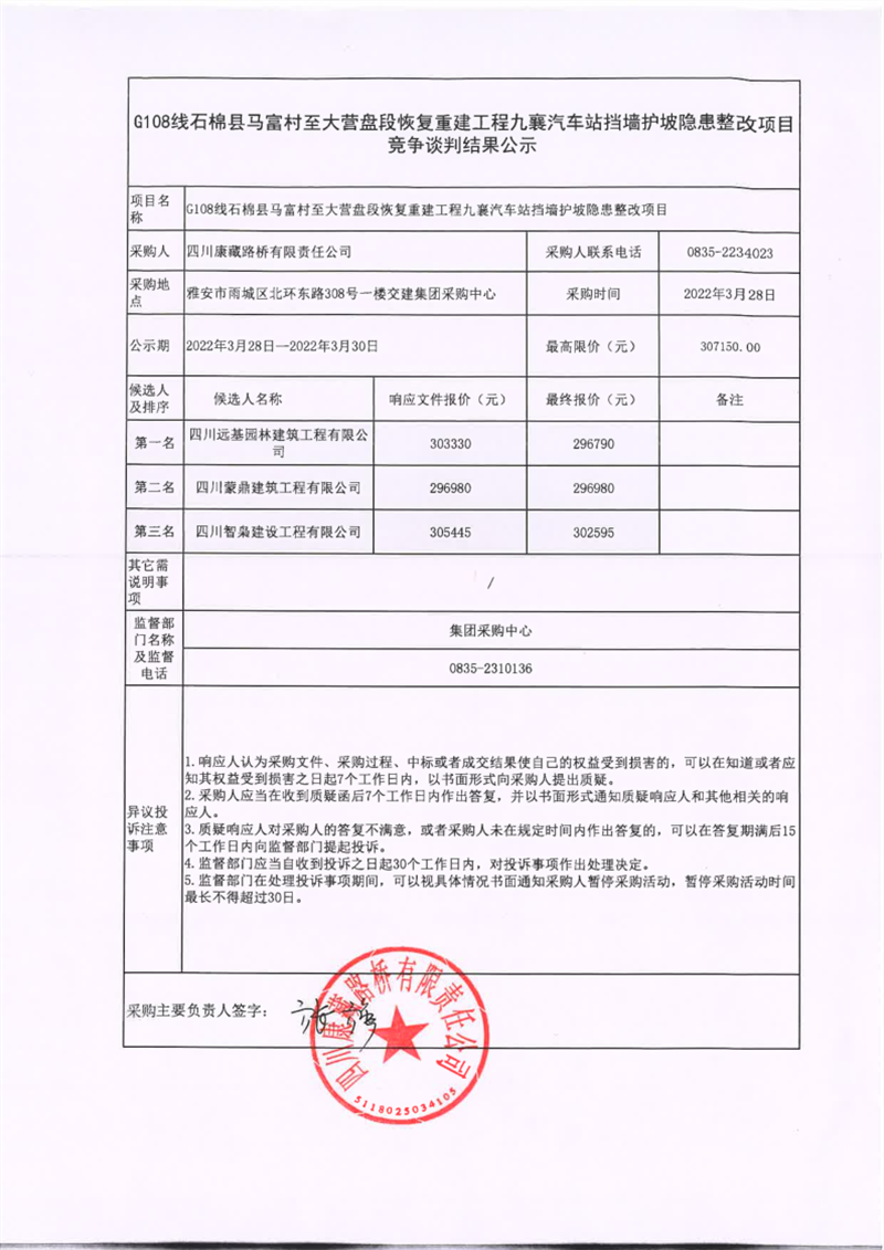 四川康藏路橋有限責任公司G108線石棉縣馬福村至大營盤段恢復重建九襄汽車站擋墻護坡隱患整改項目競爭談判結果公示