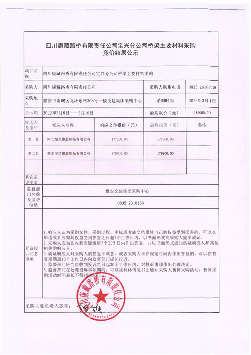 四川康藏路橋有限責(zé)任公司寶興分公司橋梁主要材料采購競(jìng)價(jià)結(jié)果公示