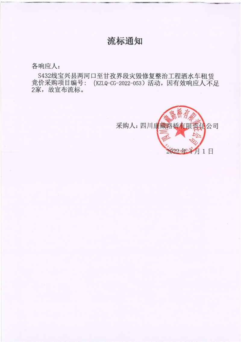四川康藏路橋有限責任公司S432線寶興縣兩河口至甘孜界段災毀修復整治工程灑水車租賃競價采購項目流標通知