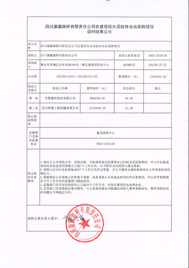 四川康藏路橋有限責任公司在建項目水泥砼拌合站采購項目談判結(jié)果公示
