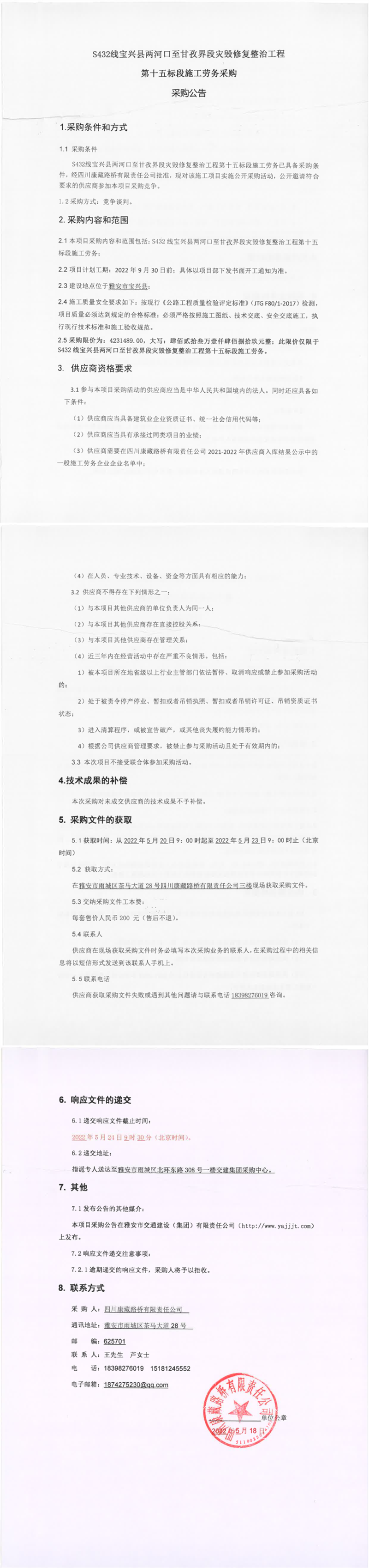 四川康藏路橋有限責(zé)任公司S432線(xiàn)寶興縣兩河口至甘孜界段災(zāi)毀修復(fù)整治工程第十五標(biāo)段施工勞務(wù)采購(gòu)采購(gòu)公告