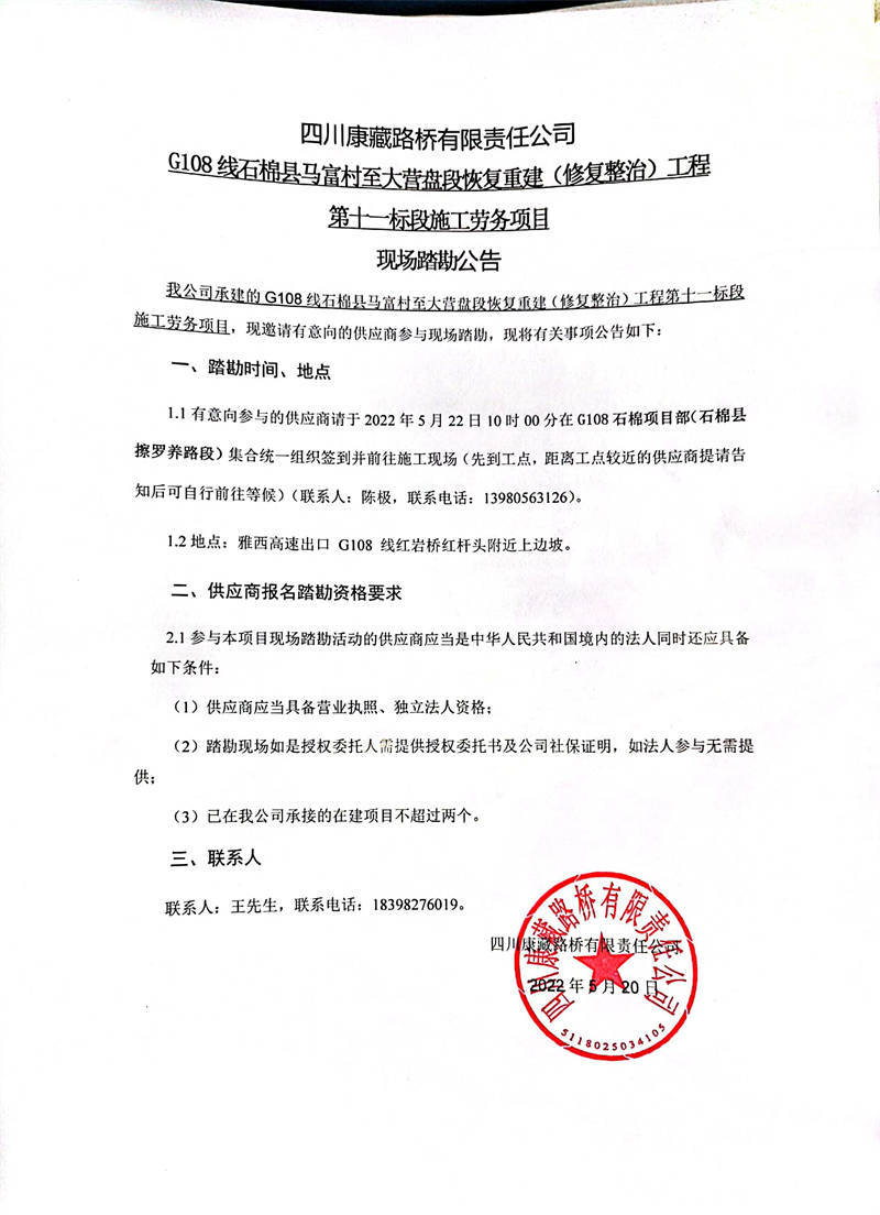 四川康藏路橋有限責任公司G108線石棉縣馬福村至大營盤段恢復(fù)重建(修復(fù)整治)工程第十一標段施工勞務(wù)項目現(xiàn)場踏勘公告