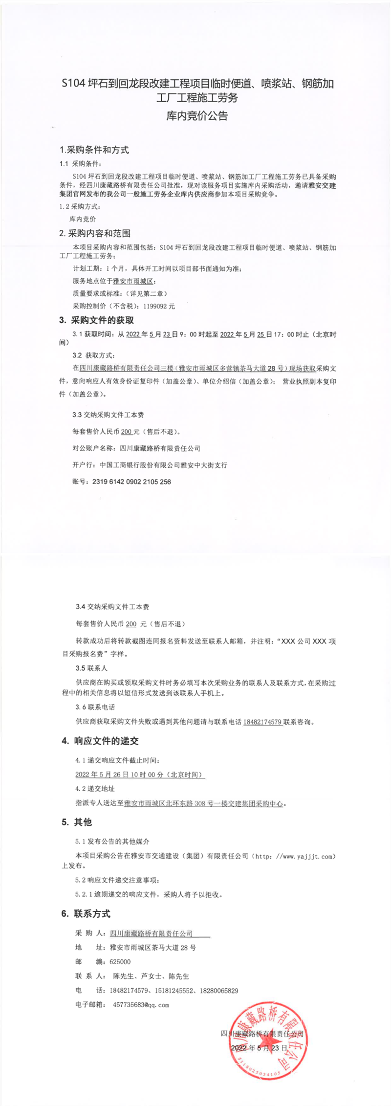 四川康藏路橋有限責(zé)任公司S104坪石到回龍段改建工程項(xiàng)目臨時(shí)便道、噴漿站、鋼筋加工廠(chǎng)工程施工勞務(wù)庫(kù)內(nèi)競(jìng)價(jià)公告