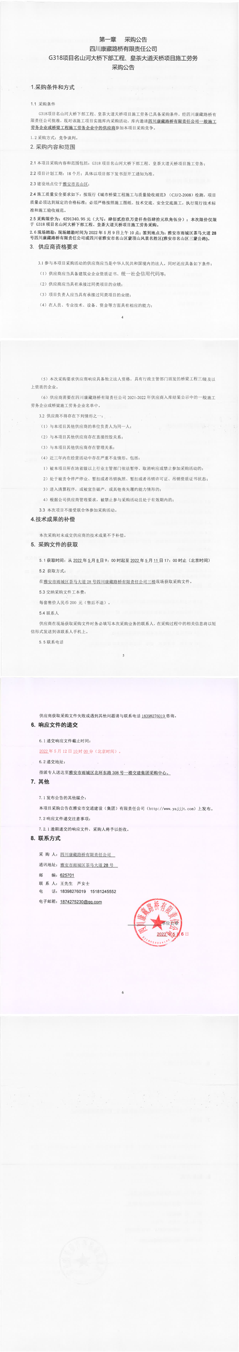四川康藏路橋有限責任公司G318項目名山河大橋下部工程、皇茶大道天橋項目施工勞務采購公告