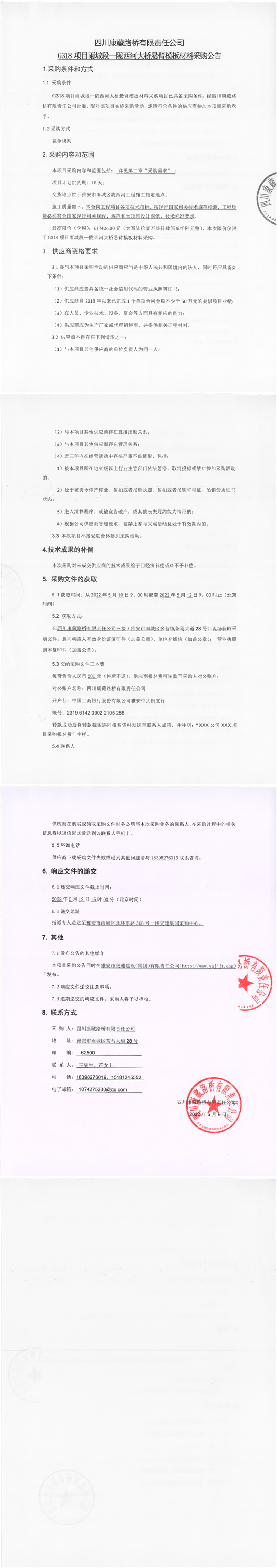 四川康藏路橋有限責(zé)任公司G318項目雨城段-隴西河大橋懸臂模板材料采購公告