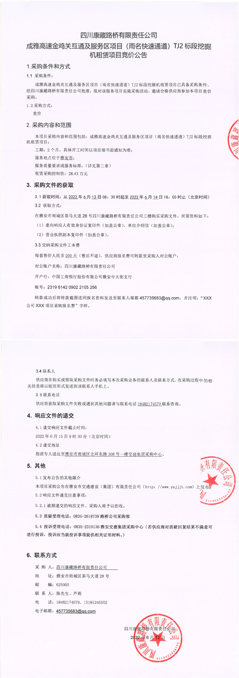 四川康藏路橋有限責(zé)任公司成雅高速金雞關(guān)互通及服務(wù)區(qū)項目(雨名快速通道)TJ2標段挖掘機租賃項目競價公告