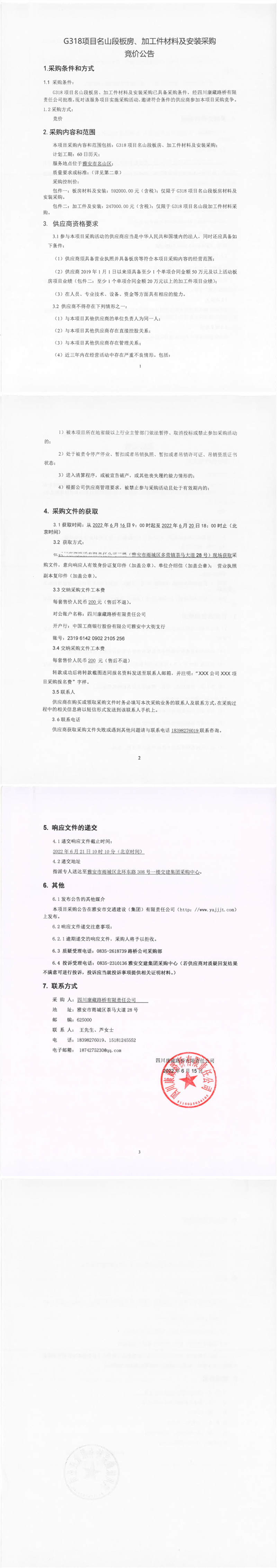 四川康藏路橋有限責(zé)任公司G318項目名山段板房、加工件材料及安裝采購競價公告
