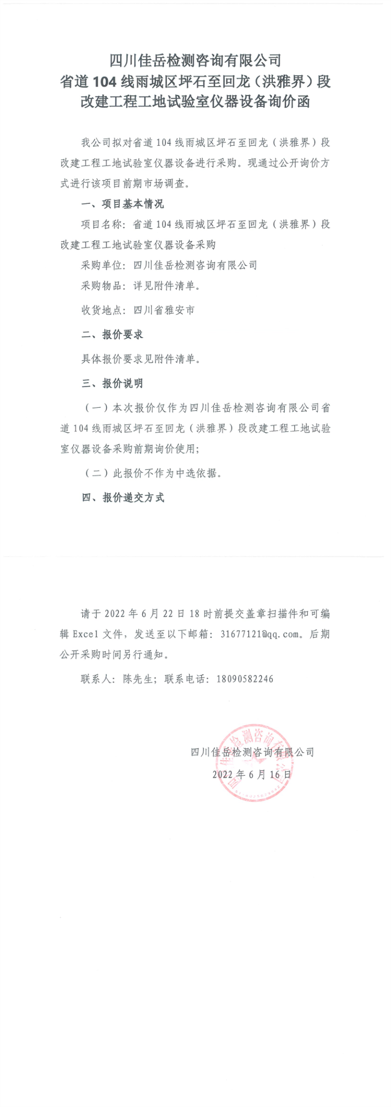 四川佳岳檢測(cè)咨詢(xún)有限公司省道104線(xiàn)雨城區(qū)坪石至回龍(洪雅界)段改建工程工地試驗(yàn)室儀器設(shè)備詢(xún)價(jià)函