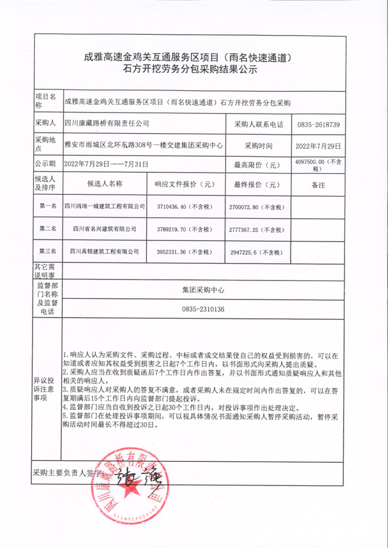 四川康藏路橋有限責(zé)任公司成雅高速金雞關(guān)互通服務(wù)區(qū)項(xiàng)目(雨名快速通道)石方開挖勞務(wù)分包采購(gòu)結(jié)果公示