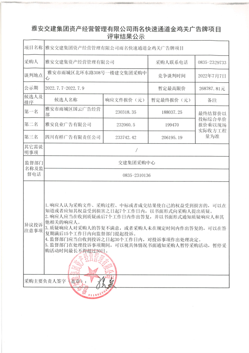 雅安交建集團(tuán)資產(chǎn)經(jīng)營管理有限公司雨名快速通道金雞關(guān)廣告牌項目評審結(jié)果公示