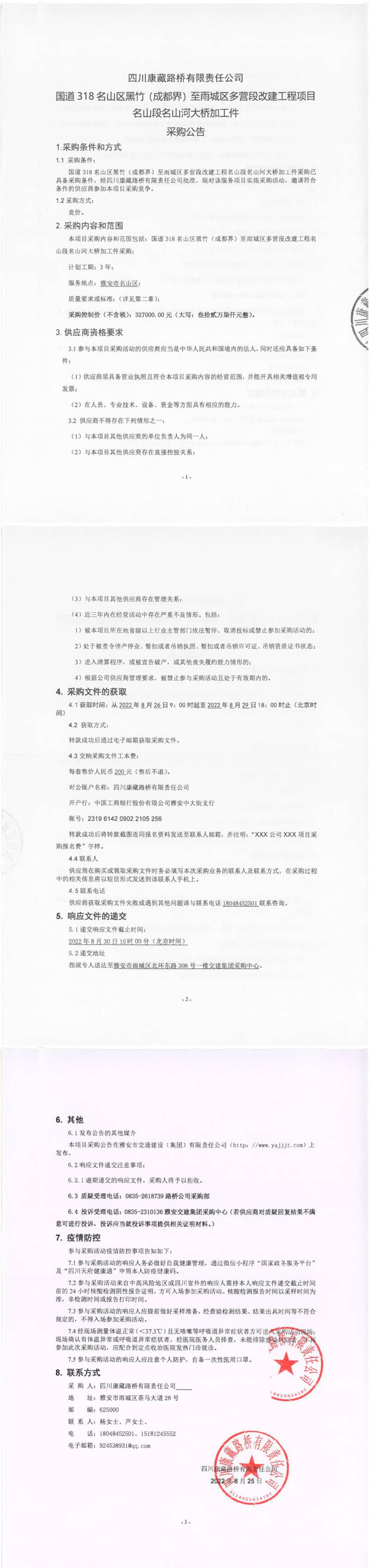 四川康藏路橋有限責(zé)任公司國道318名山區(qū)黑竹(成都界)至雨城區(qū)多營(yíng)段改建工程項(xiàng)目名山段名山河大橋加工件采購公告