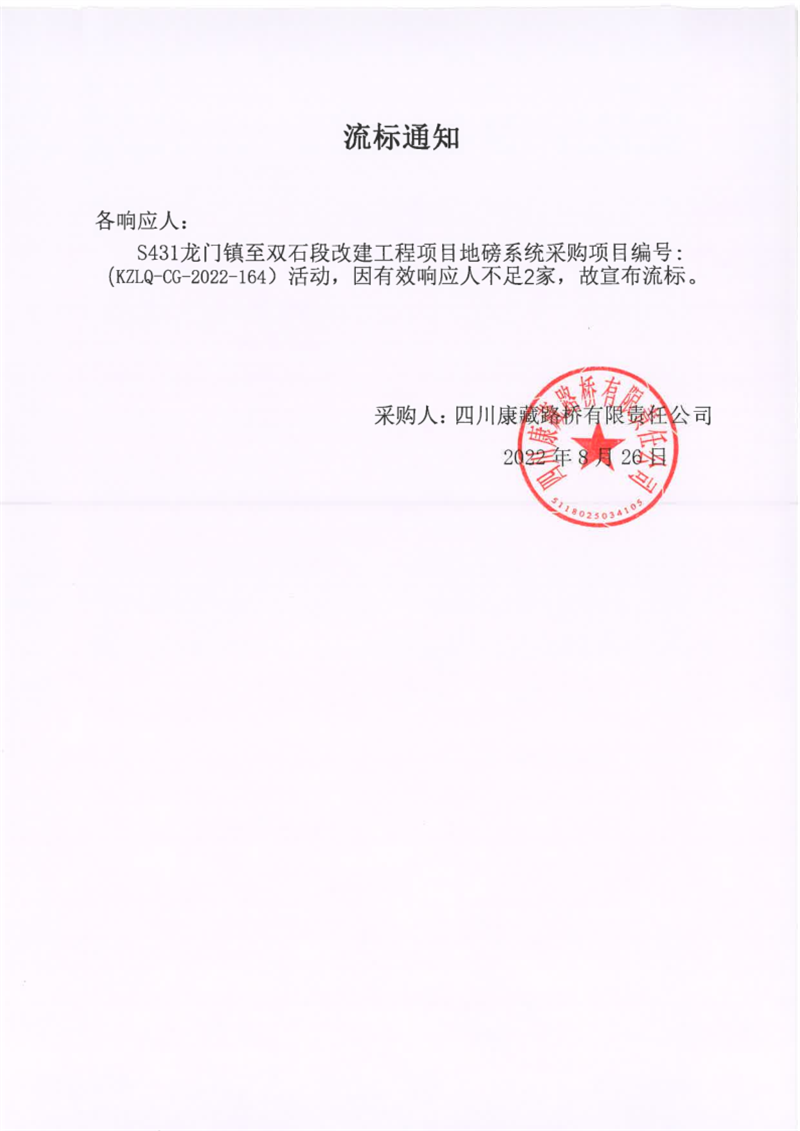 四川康藏路橋有限責(zé)任公司S431龍門鎮(zhèn)至雙石段改建工程項目地磅系統(tǒng)采購項目流標通知