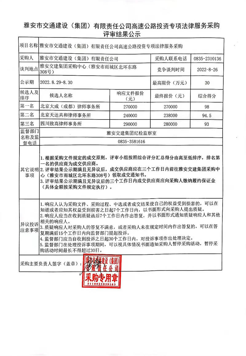 雅安市交通建設(shè)(集團)有限責(zé)任公司高速公路投資專項法律服務(wù)采購評審結(jié)果公示
