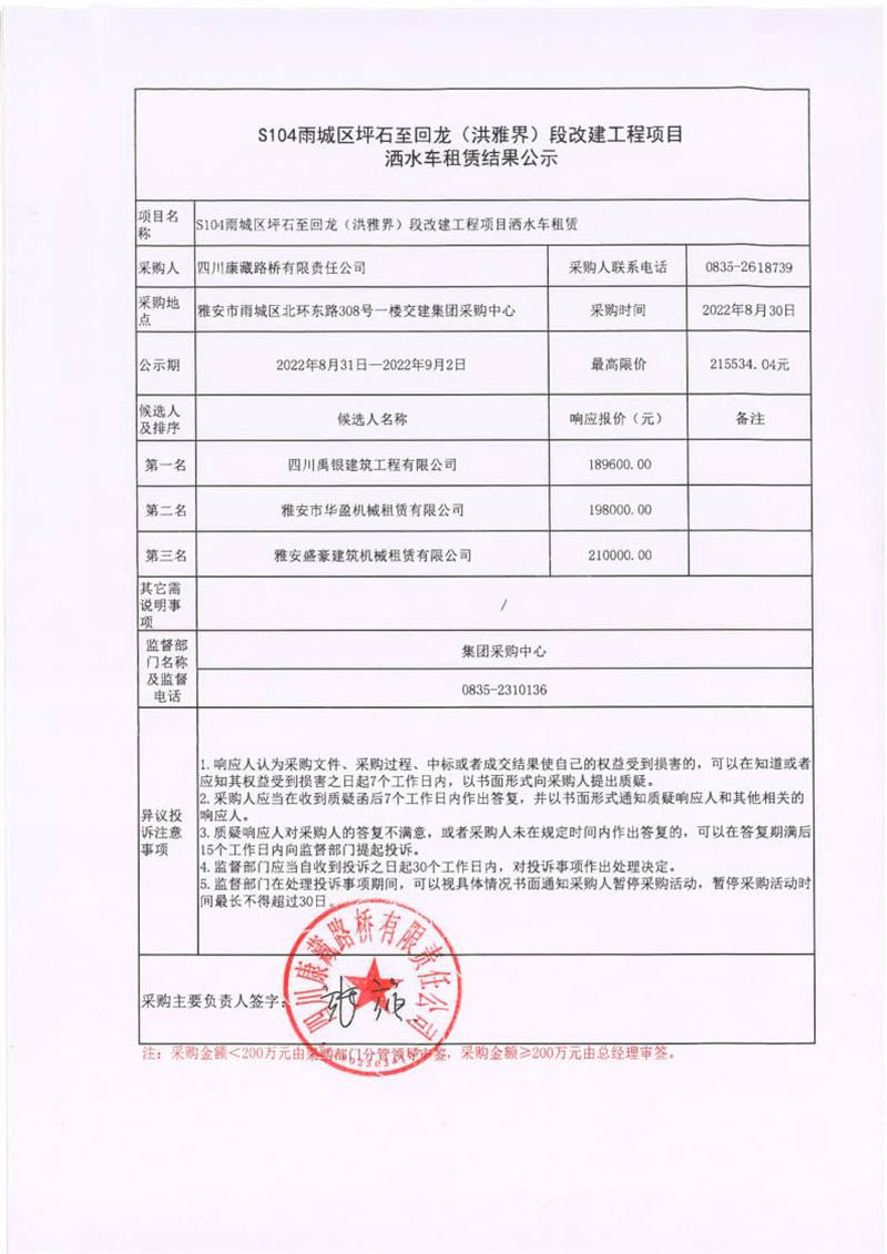 四川康藏路橋有限責任公司S104雨城區(qū)坪石至回龍(洪雅界)段改建工程項目灑水車租賃結果公示