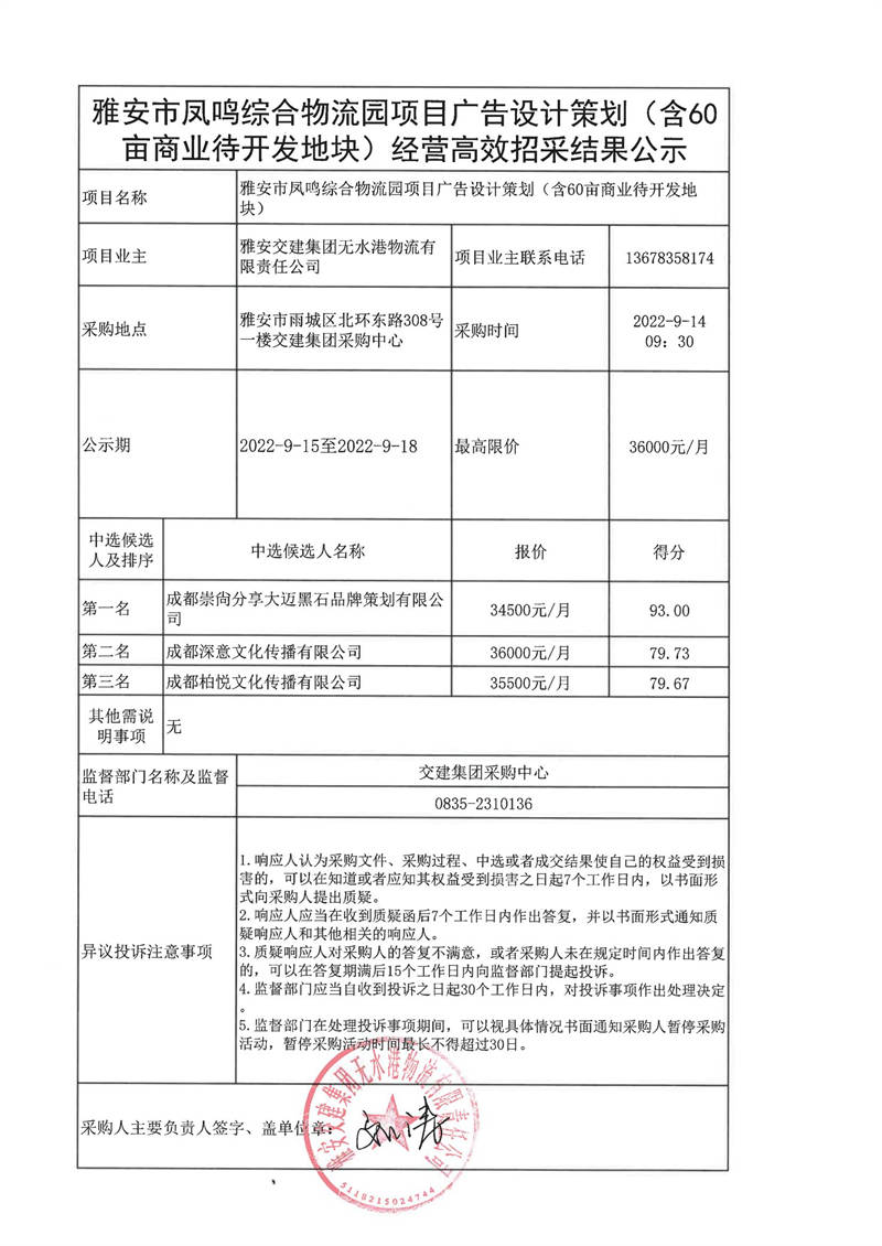 雅安交建集團無水港物流有限責任公司雅安市鳳鳴綜合物流園項目廣告設計策劃(含60畝商業(yè)待開發(fā)地塊)經(jīng)營高效招采結(jié)果公示