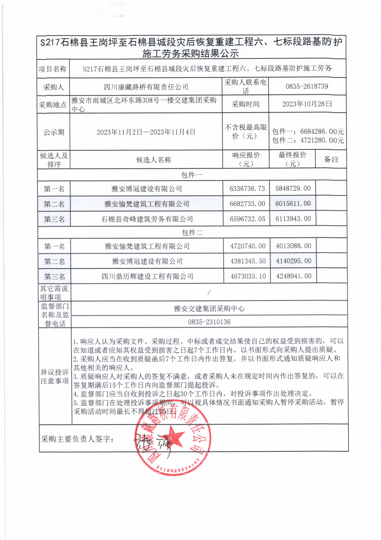 四川康藏路橋有限責(zé)任公司S217石棉縣王崗坪至石棉縣城段災(zāi)后恢復(fù)重建工程六、七標(biāo)段路基防護(hù)施工勞務(wù)采購(gòu)結(jié)果公示