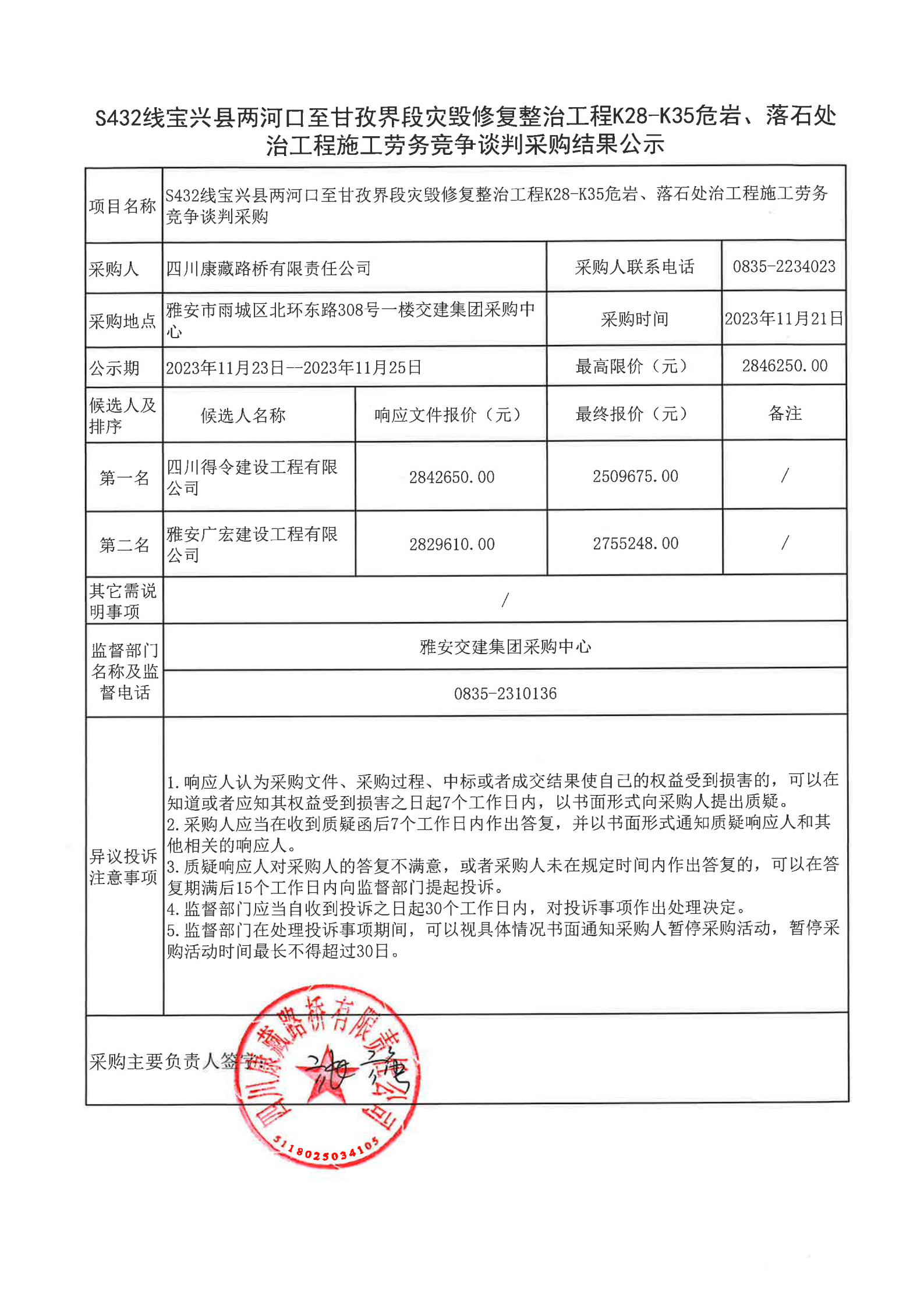 四川康藏路橋有限責(zé)任公司S432線寶興縣兩河口至甘孜界段災(zāi)毀修復(fù)整治工程K28-K35危巖、落石處治工程施工勞務(wù)競爭談判采購結(jié)果公示