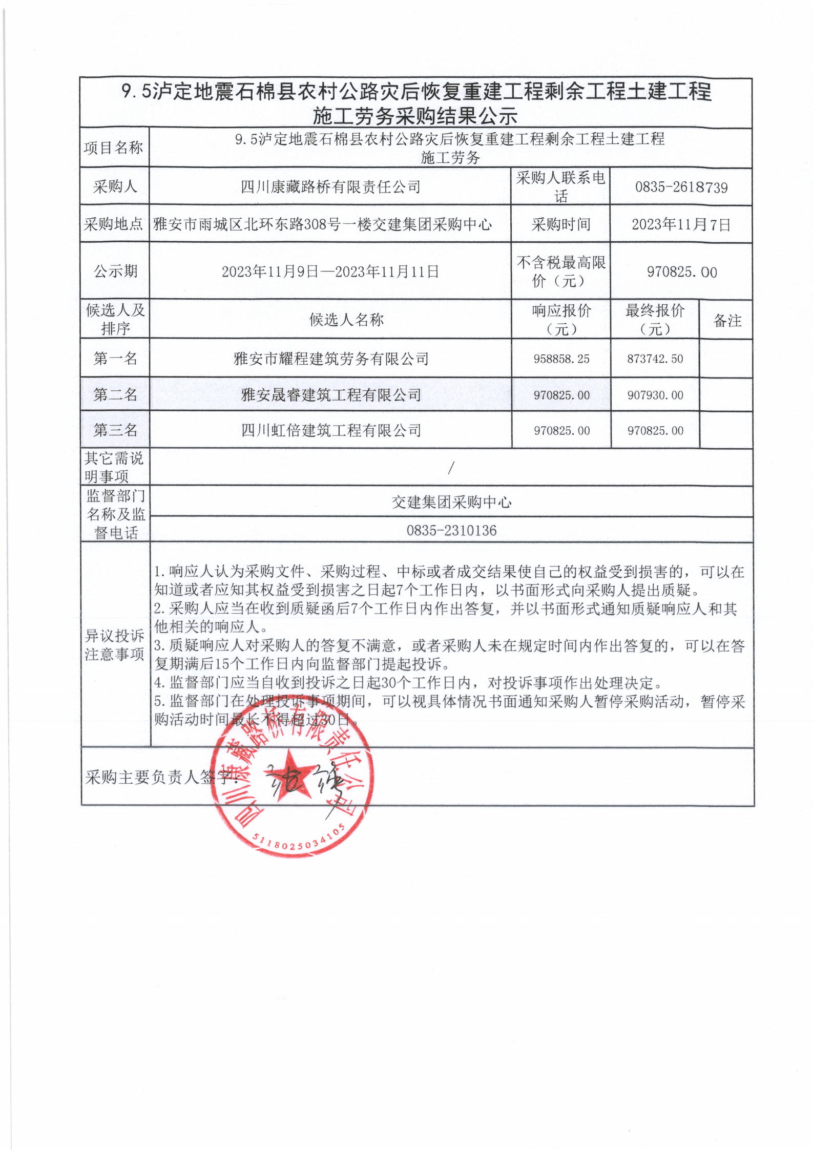 四川康藏路橋有限責任公司9.5瀘定地震石棉縣農(nóng)村公路災后恢復重建工程剩余工程土建工程施工勞務采購結果公示