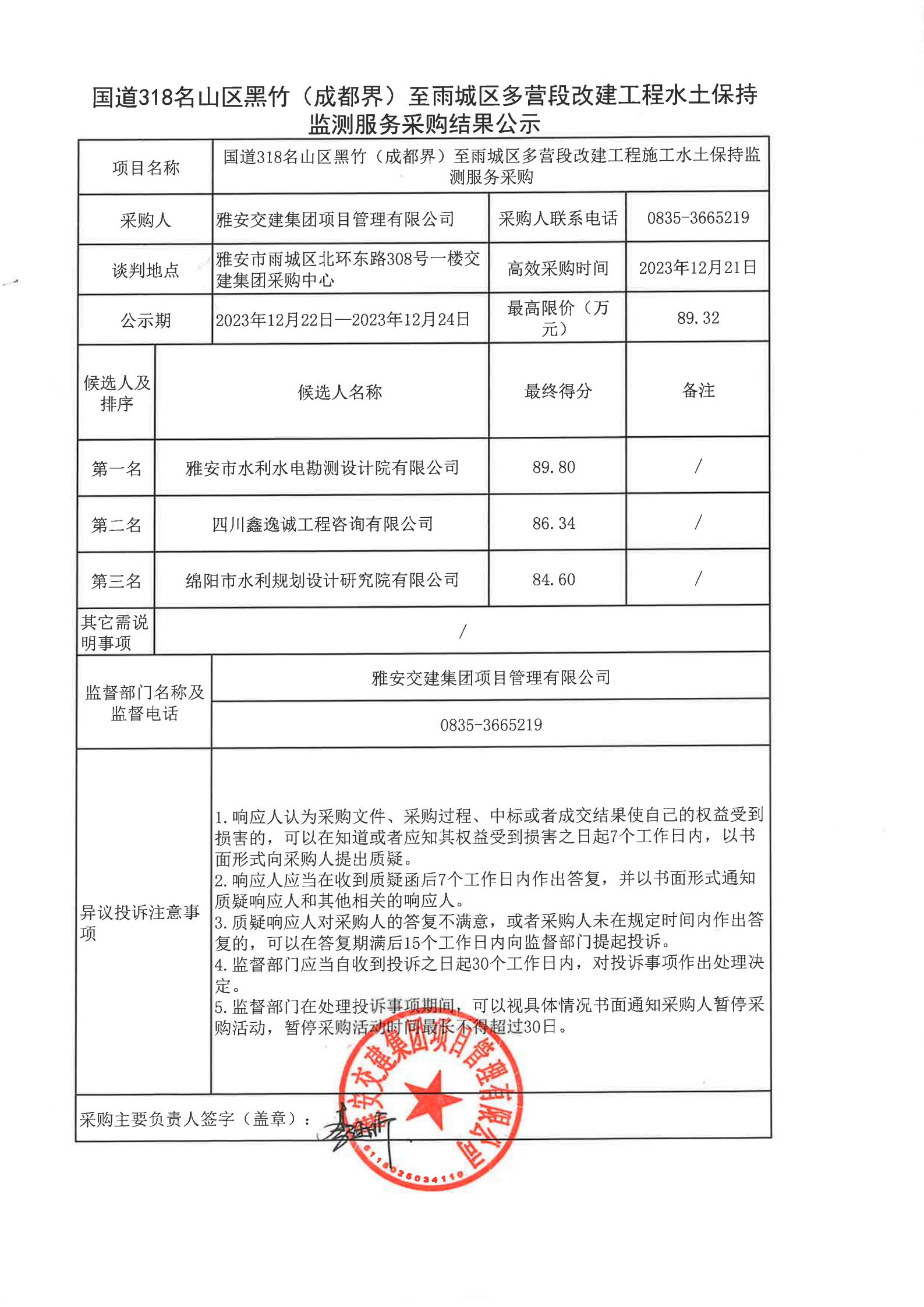 雅安交建集團(tuán)項(xiàng)目管理有限公司國道318名山區(qū)黑竹(成都界)至雨城區(qū)多營段改建工程水土保持監(jiān)測(cè)服務(wù)采購結(jié)果公示