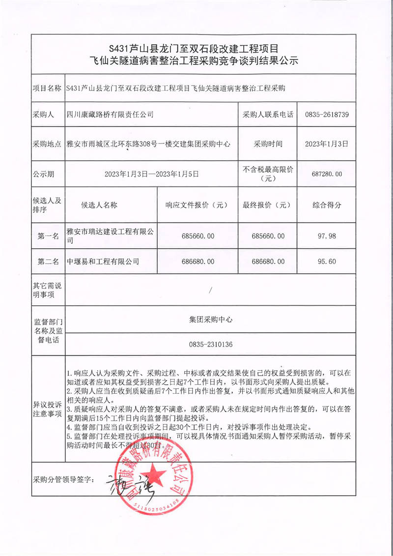 四川康藏路橋有限責(zé)任公司S431蘆山縣龍門至雙石段改建工程項(xiàng)目飛仙關(guān)隧道病害整治工程采購競(jìng)爭談判結(jié)果公示