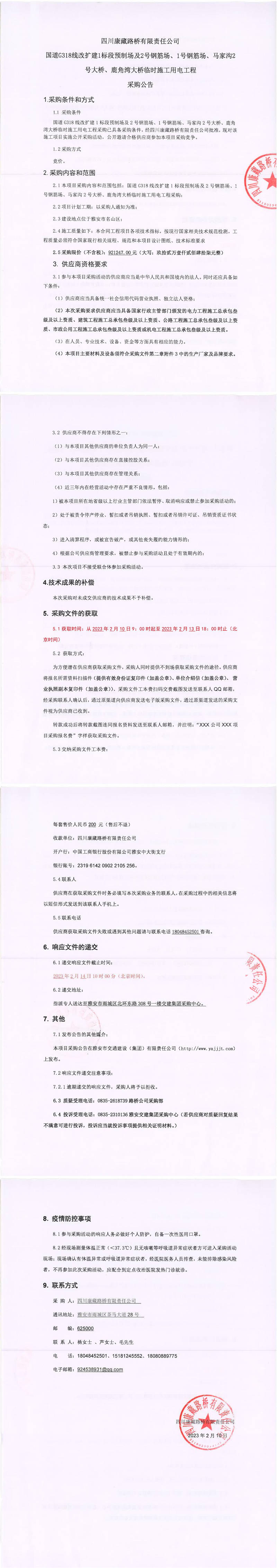 四川康藏路橋有限責(zé)任公司國(guó)道G318線改擴(kuò)建1標(biāo)段預(yù)制場(chǎng)及2號(hào)鋼筋場(chǎng)、1號(hào)鋼筋場(chǎng)、馬家溝2號(hào)大橋、鹿角灣大橋臨時(shí)施工用電工程采購公告