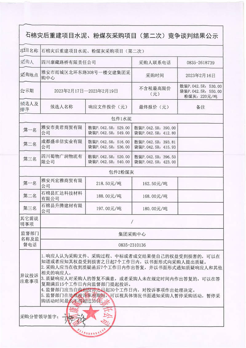 四川康藏路橋有限責(zé)任公司石棉災(zāi)后重建項(xiàng)目水泥、粉煤灰采購項(xiàng)目(第二次)競(jìng)爭(zhēng)談判結(jié)果公示