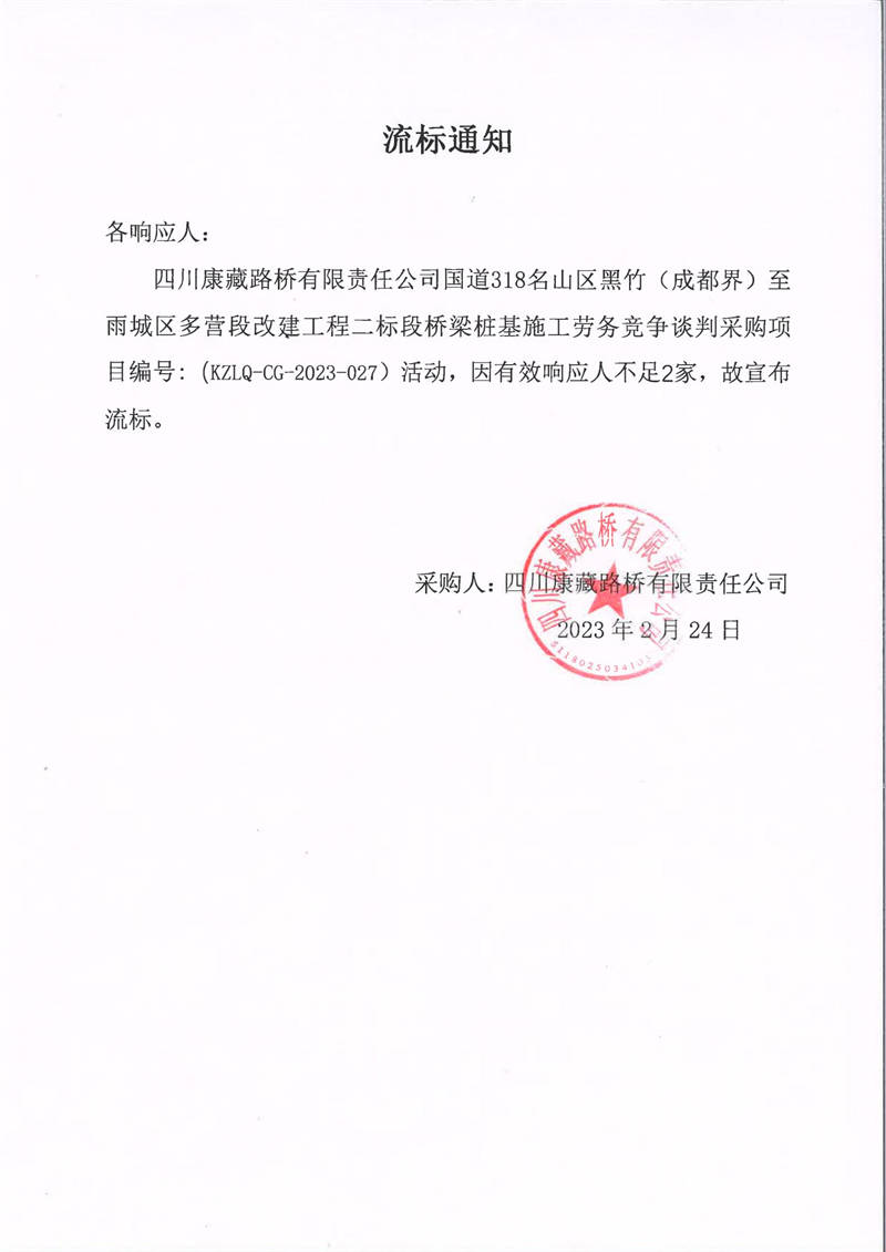 四川康藏路橋有限責(zé)任公司國道318名山區(qū)黑竹(成都界)至雨城區(qū)多營段改建工程二標(biāo)段橋梁樁基施工勞務(wù)競爭談判采購流標(biāo)通知