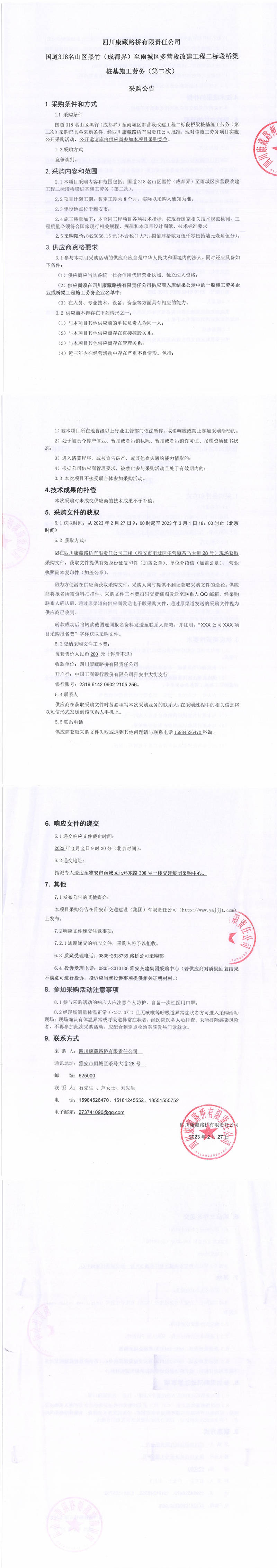 四川康藏路橋有限責(zé)任公司國道318名山區(qū)黑竹(成都界)至雨城區(qū)多營段改建工程二標(biāo)段橋梁樁基施工勞務(wù)(第二次)采購公告